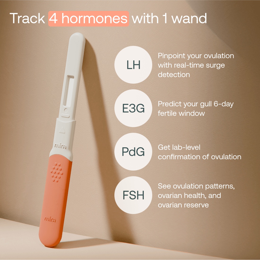 The first and only 4-in-1 wand powered by fluorescent technology for the most accurate results in at-home hormone tracking. Track FSH, LH, E3G, and PdG in just one test. Get decisive cycle and hormone insights—from ovulation quality to ovarian reserve and implantation support.