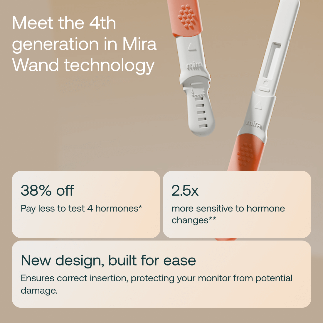 * Compared to the combined price of 20 Mira Max and 20 Ovum Wands ($158.99). ** According to quality report, the new generation of Mira Wands has 2.5x higher LH sensitivity and 40% improved repeatability compared to the previous generation. *** Compared to Max and Ovum Wands tested together, which take 37 min