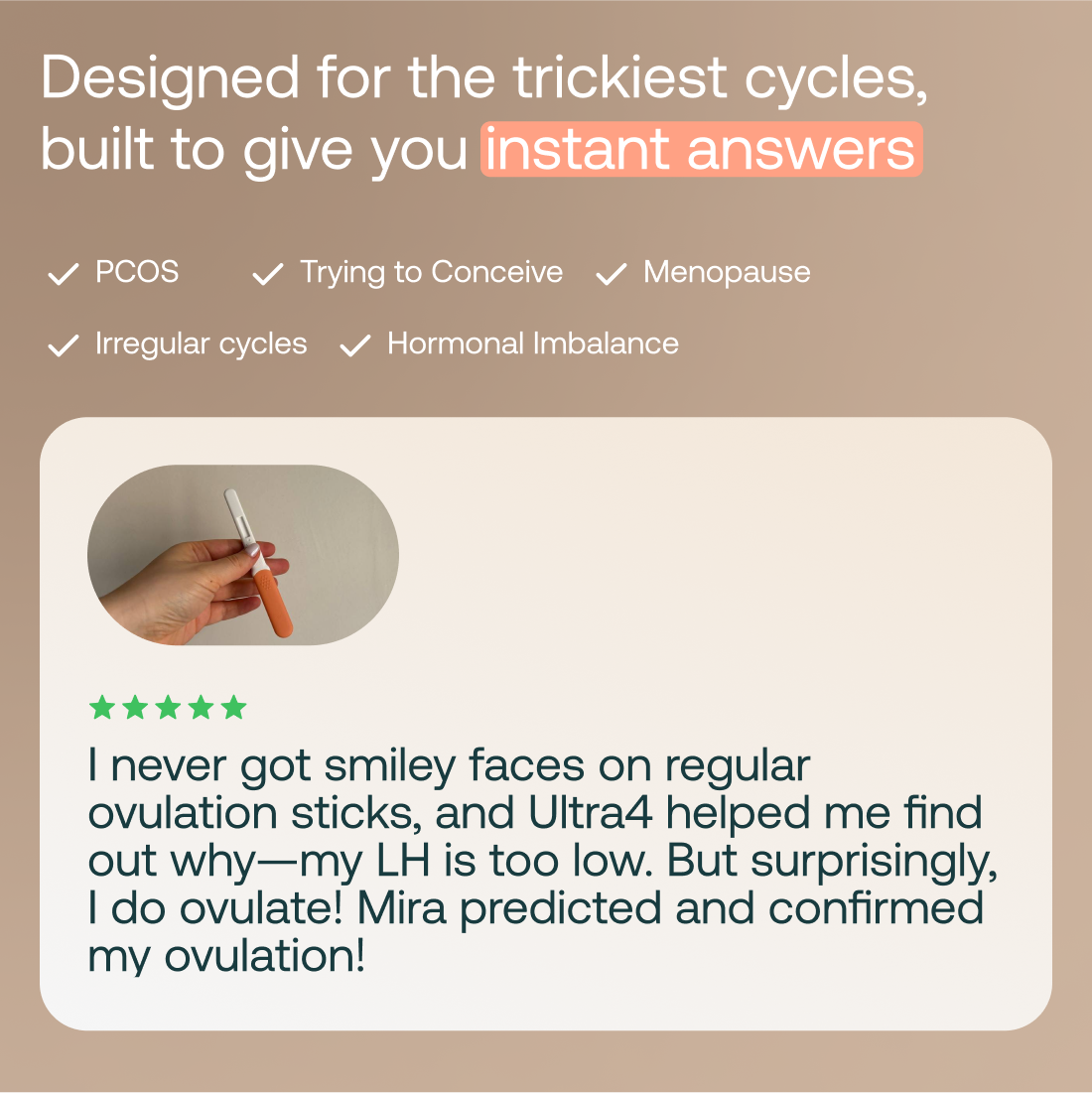 My cycle was all over the place, and I never knew when to plan around it. Mira Ultra4 uncovered hidden patterns, showing me that my delayed estrogen surge pushed my ovulation later than expected. I now know when I ovulate.