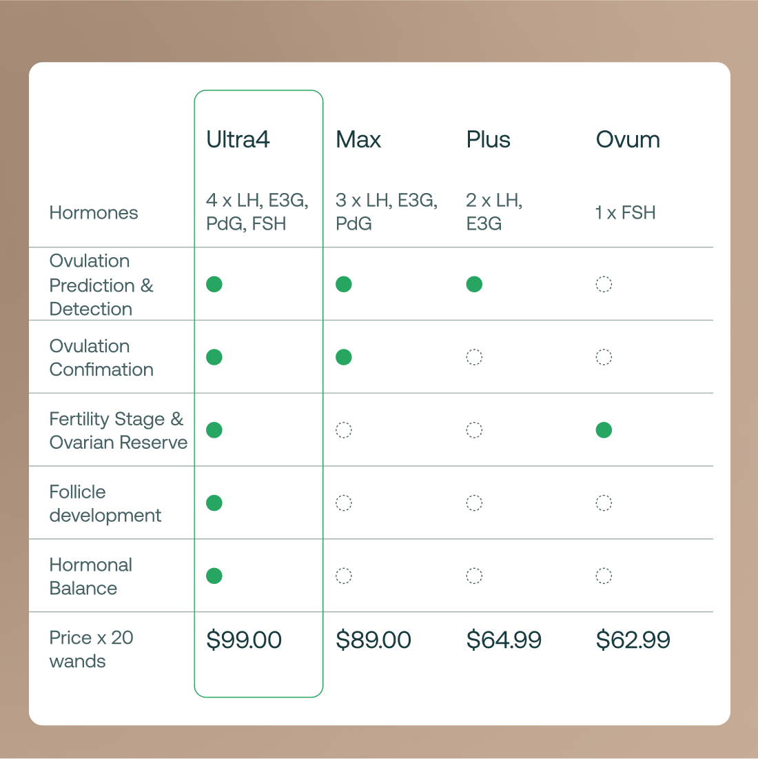 We recommend using only Ultra4 Wands throughout a cycle to keep your hormone tracking consistent. Ultra4 is our most advanced wand yet—designed to measure all four key hormones in one test. It features improved LH sensitivity (2.5× higher) and up to 40% better repeatability compared to previous generations. Using a single wand type throughout your cycle helps ensure you're getting the most accurate results possible