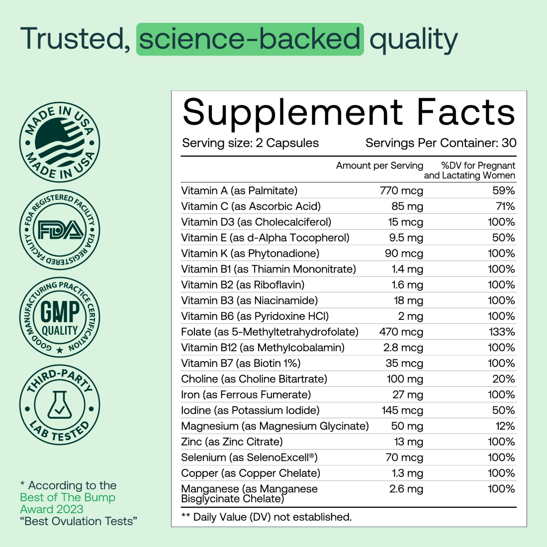 We got you covered every step of the way. Our vitamins were meticulously crafted to meet pre-pregnancy, pregnancy, and post-pregnancy nutritional needs. Our team of experts, drawing on years of experience in reproductive health, the latest scientific research, and in collaboration with OB/GYNs, have thoughtfully handpicked these ingredients to support your journey.